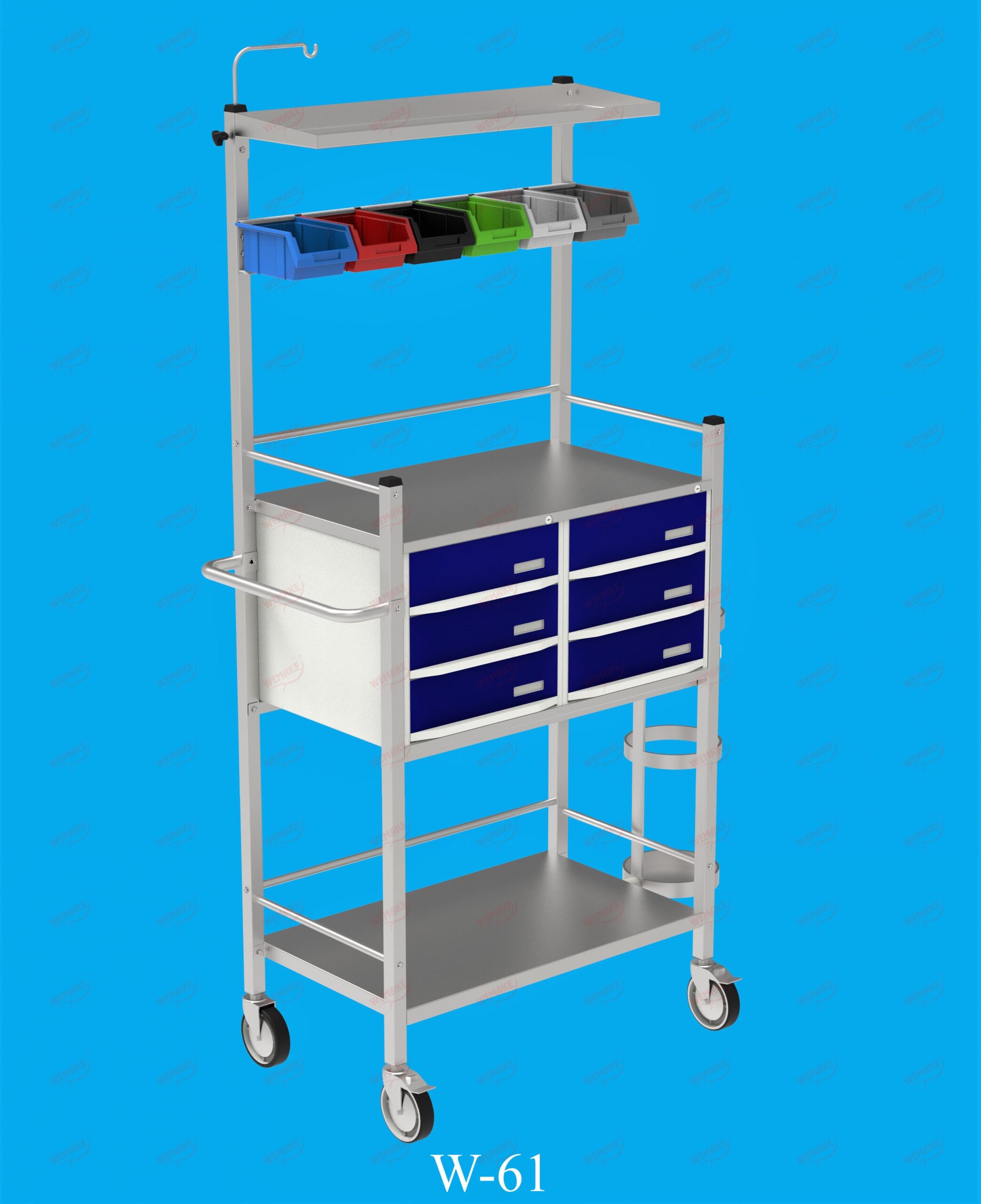 A fully equipped emergency trolley with provisions for attaching an oxygen cylinder. Designed for rapid deployment in critical situations, it features organized compartments and smooth mobility.